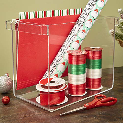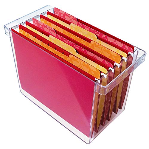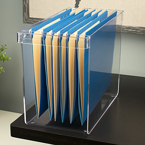Set this Hanging File Organizer right on the desktop for easy access to your most important files. This clear desktop organizer is stylish but sturdily built, holding 8.5" x 11" hanging file folders (not included). Folders slide easily on the rails. Handles are built in for easy portability to meetings and home. Dress it up with colorful hanging folders to match your décor. For another great use of this product, use as a storage bin to organize your pantry or cabinets. Handles make it convenient to pull in and out for easy access. Great to help de-clutter your kitchen! Made in USA.SPACIOUS organizer is proudly made in USA