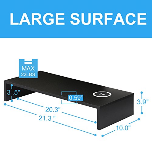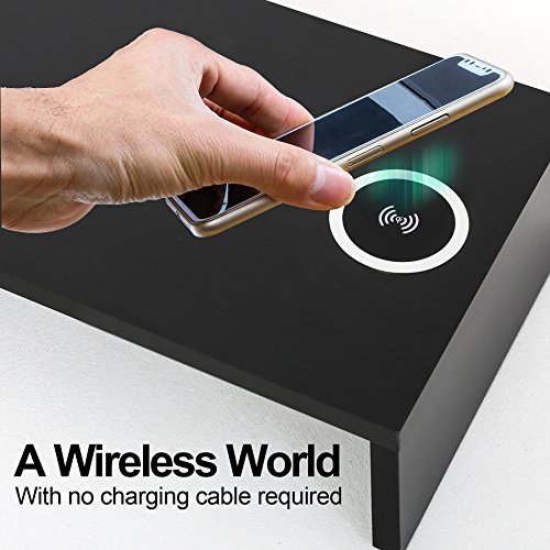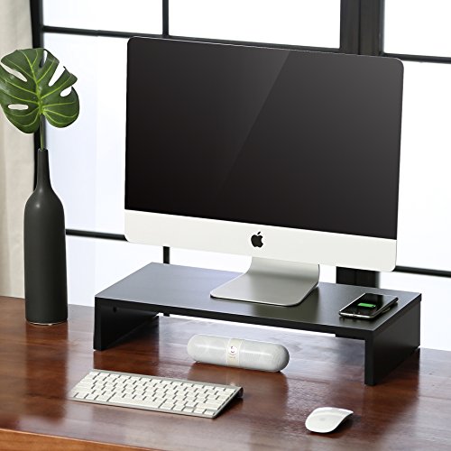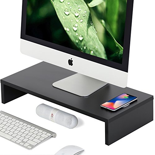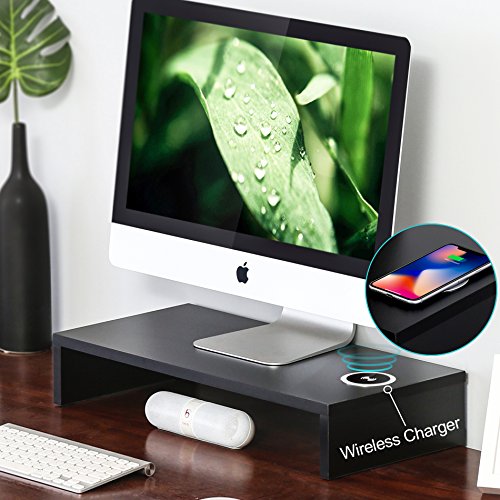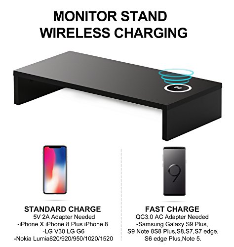Elevate your computer screen and organize your desktop in modern design with this monitor stand.With this wireless charging pad, you can charge your compatible Qi standard devices, without the need to plug your phone directly in to a wall charger or USB port. Simply connect the wireless charging pad to a power source and place your phone onto the charging pad and your phone begins to charge automatically.The large top surface could accommodate your appliances well and you may put the keyboard or cooling fun underneath.NEW SMART PRODUCT -- The monitor organizer is combined with a wireless charging pad. It is made from particle board to prevent desktop surfaces from scratches, simple and slim.