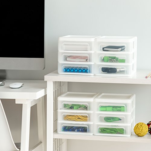 Compact and convenient, these 3 drawer desktop units make the most of the lack of desk space. Squeeze the mini drawer unit into open space, or create a row of them for even more storage. The sturdy makes these drawers durable, and the smooth glide drawers give you easy access to contents. The flat top is perfect for storing additional supplies or displaying small pictures. The 3 drawer shelf is also great for everything from accessories, to tool pieces, to small bathroom supplies, and more. Made in the USA. Set of four.These compact drawers are the perfect way to make the most of a cluttered space.