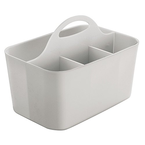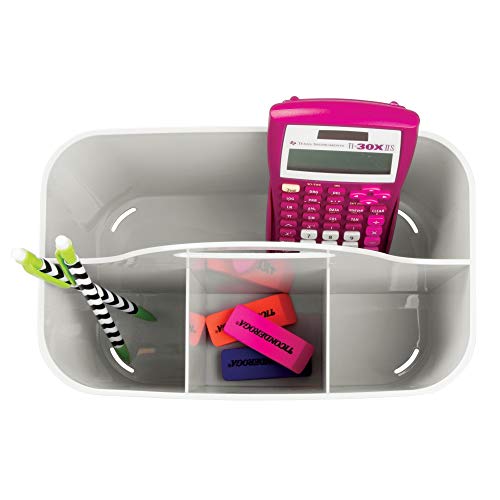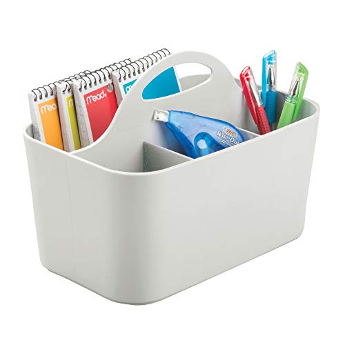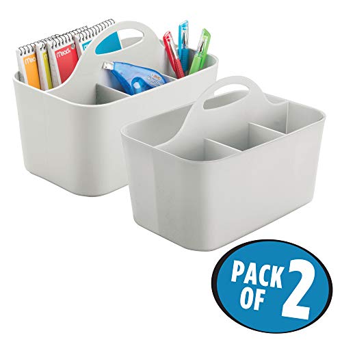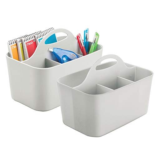 The mDesign Office and Desk Storage Caddy Bin creates a neat and tidy workspace. Use it in the office, at school, in your art studio, or in a garage work shop. Built-in handle makes it easy to transport. Keep all of your office supplies organized and easy to find. These versatile containers are great in any room of the home - many use them in the shower to hold shampoo, soap, razors or in the kitchen storing silverware utensils. Drainage holes make this the perfect portable bath caddy for dorm rooms. mDesign - more calm, less clutterINSTANT ORGANIZATION: Generously sized with 4 compartments of different sizes for maximum versatility; Create space-saving storage in closets, shelves, cabinets,, desktops or on any work surface; Use multiple bins to create the storage solution right for you; Perfect for storing extra office supplies such as staples, highlighters, paper clips, binder clips, notepads, sticky notes, washi tape, glue sticks and more; Great for personal items, cell phones, wireless headphones, glasses; Set of 2
