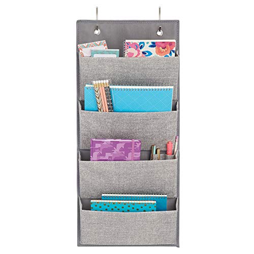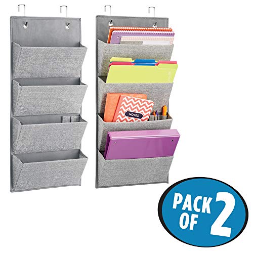 Create extra storage in your home office or work space with the Fabric Over the Door Hanging Storage Organizer from mDesign. Hang organizers over interior doors with the two included hooks for quick and easy storage. The deep pockets keep items secure when you open and close doors. Two smaller pockets in the middle hold smaller supplies like pens, pencils and highlighters.INSTANT ORGANIZATION: Store and organize file folders, tablets, notebooks, pens, pencils, books, letters, envelopes, magazines, catalogs, scissors, and more; The middle pocket features 2 smaller sections to keep little items secure; Great for storing personal items, such as cell phones, headphones, water bottle, reading glasses and other office needs; Set of 2