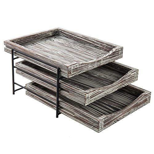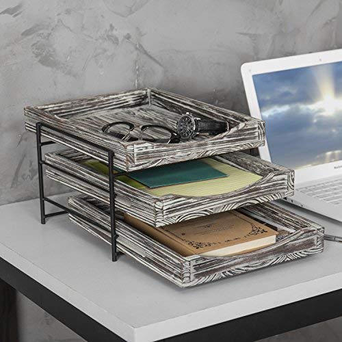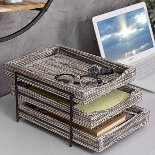 Even an office decorated in rustic decor needs to keep organized, and this weathered whitewashed wood and black metal document organizer helps maintain organization while adding a touch of country charm. Capable of holding documents as well as most magazines, this stylish organizer can be used at home, in addition to the office. Sliding trays provide easy access to tray contents, and the 3-tier design maximizes limited desk and counter space.