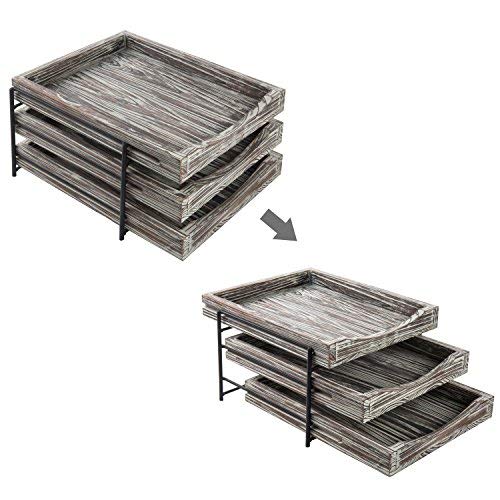 DESKTOP DOCUMENT ORGANIZER: 3-tier document stand in weathered wood and black metal with sliding trays.RUSTIC STYLE: Distressed whitewash finish and black metal complement rustic decors.