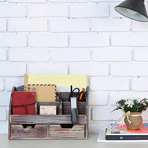 A desktop organizer made of wood with a rustic-style distressed finish.Features 2 slide-out drawers and 6 compartments on 3 levels.
