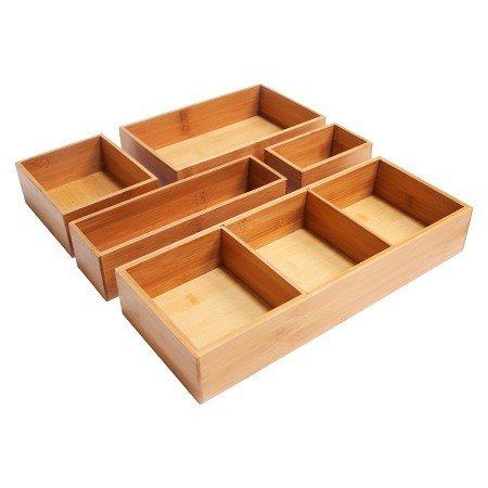 Conveniently organize your kitchen and desk drawers with these Seville Classics Bamboo Drawer Organizer Boxes. This set of 5 boxes is made of eco-friendly high quality bamboo and constructed with attractive, clean joints for added durability. Bamboo is 16% more durable than solid maple. Each box is designed to fit snuggly together or can be used separately to help clear the clutter around the kitchen or office. These useful the boxes can hold everything from perishables to paperclips and can keep flatware, cutlery, kitchen gadgets, office supplies and cosmetics neatly organized. The boxes together measures 15 in. x 15 in. x 2.5 in. high. Each individual box measures (all 2.5 in. H): 3 in. x 5 in., 3 in. x 10 in., 6 in. x 5 in., 6 in. x 10 in., 6 in. x 15 in.Material: Bamboo Care and Cleaning: Wipe Clean with a Dry Cloth