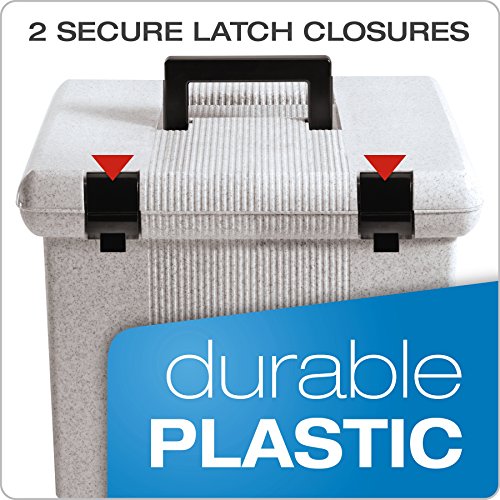 The Pendaflex Portable File Box gives you a complete, ready-to-use portable filing system with a durable built-in handle and secure latch closure. This granite file boxes contains 3 black Pendaflex Reinforced Hanging Folders with clear plastic tabs and inserts. Each file box holds up to 22 letter-sized hanging folders. 11" H x 14" W x 11-1/8" D.Create the perfect portable file system for on-the-go organization