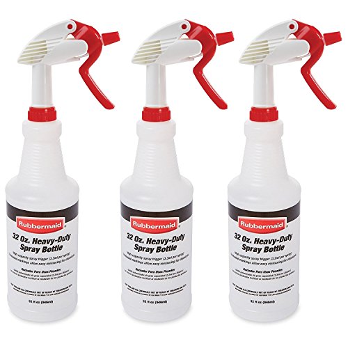 Finally, a heavy-duty sprayer made with durability in mind. The Rubbermaid 32-oz Heavy Duty Spray Bottle is a high-capacity workhorse designed to keep going where others fail. The large, 32oz bottle means less time spent refilling, while graduated markings make proper mixing a snap. The 3-finger trigger comfortably delivers a full 3cc?s with each spray, and features a locking spray cap as well as a filtered stem that reaches all the way to the bottom of the bottle. Heavy-duty construction resists drops, bumps, and leakage, even if held upside down or squeezed. Why keep buying cheap bottles that continually need replacement? The Rubbermaid 32-oz Heavy Duty Spray Bottle is a professional-grade solution.Includes 32 oz bottle with trigger sprayer