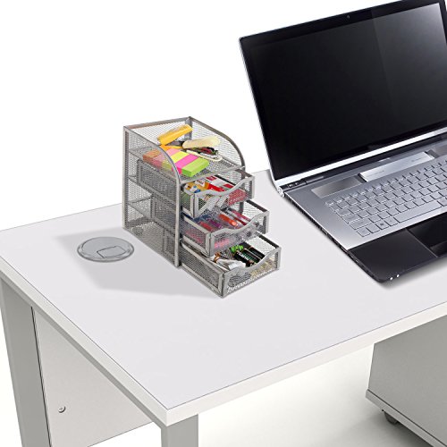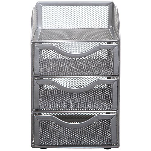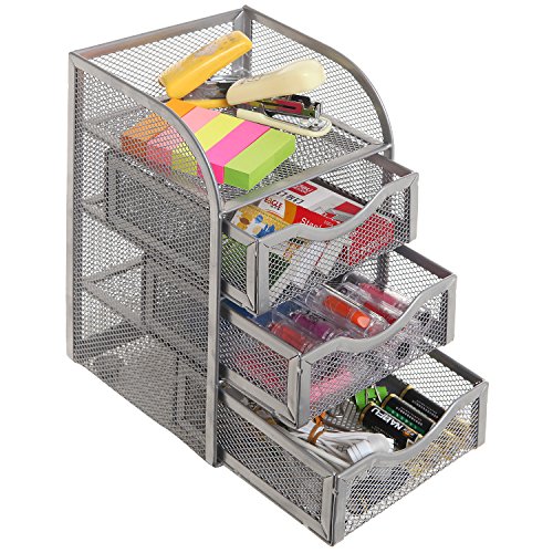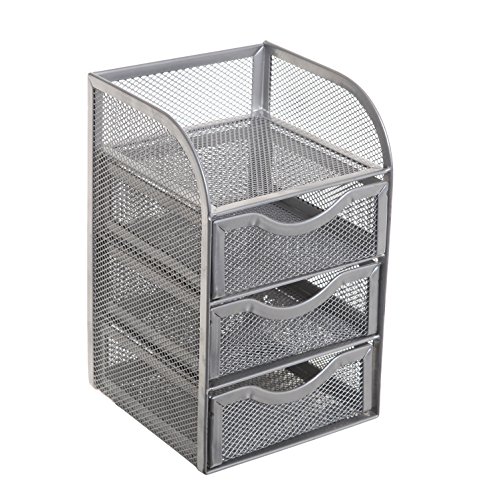 Keeping your desk organized can be tough sometimes. With this desktop organizer rack, your work space can be organized and efficient. Made of a sturdy wire mesh coated with a matte paint finish, this useful desk organizer helps you keep your various office supplies organized into 3 slide-out drawers and 1 top shelf that can accommodate everything from pens and sticky notes to staplers. Set this mini supply cabinet on your desk, and you'll have just what you need to create an organized and productive work space.