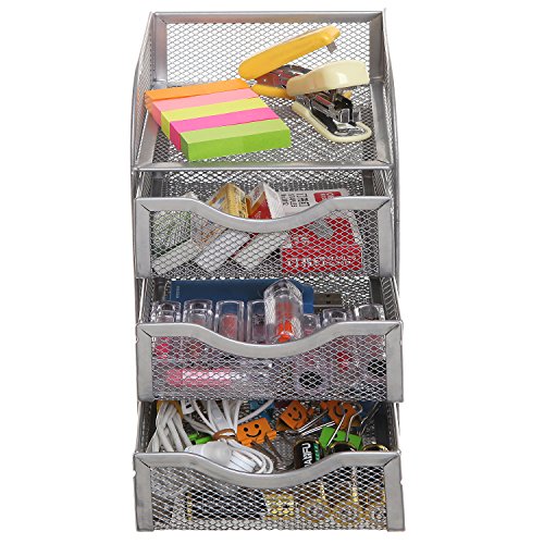 Perfectly sized for your desk, this small supply cabinet is made of sturdy metal mesh and is ideal for the home or office.Features 4 compartments: 3 slide out drawers and 1 open top shelf.