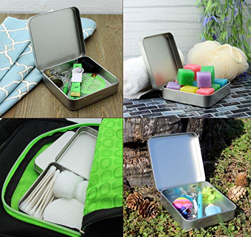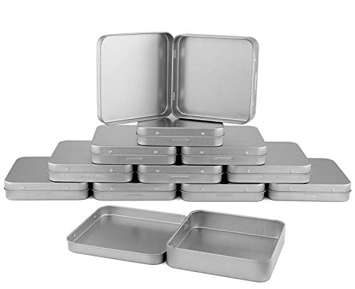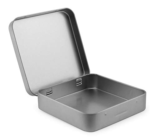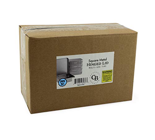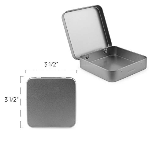 Uses: * Arts & crafts * Party favors * Candies & mints * Herbs * Lip balms and cosmetics * Nails, screws, fishing flies, etc. * Survival kit (mini first aid kit, mini fishing kit, fire starters, sewing kit) * Treasure box * Earbud storage, small battery storage, etc. * Store game pieces * Geocaching Features: Rounded corners Beveled edges Perfect square (not rectangle) Double hinge back Snap-close lid Brushed silver color Size: 3.75 x 3.75 inches and .75 inches tall Capacity: ½ cup = 4 ounces (volume not weight) Weight: 1.5 ounces each Quantity:24 tins Material: steel with tin coating Not suitable for liquids; use for food (candy, nuts), dry goods or balmsBULK VALUE 24-PACK: Receive two dozen square hinged tinsSTYLE: Square with rounded corners & beveled edges; double hinge back, snap-closed front COLOR: Brushed silver