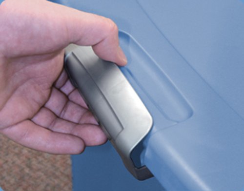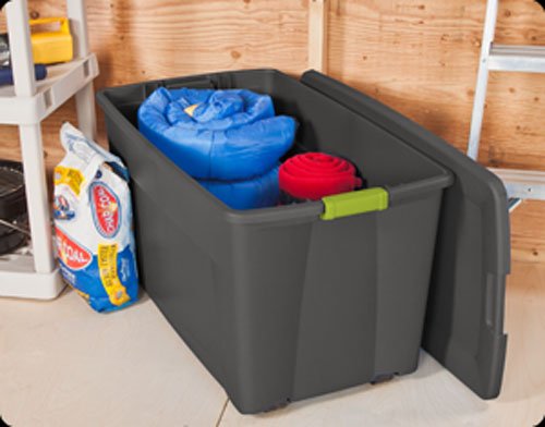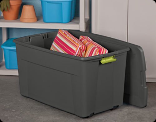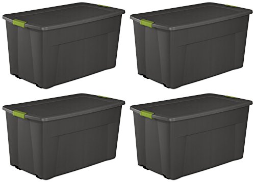 Sterilite Latch Tote Lapis Lid and Base with Titanium Latches with Black Wheels. Latching products offer the peace of mind consumers desire when purchasing a heavy duty tote product. They are durable and functional storage containers that include a color accented latch and an indexed lid for secure stacking.