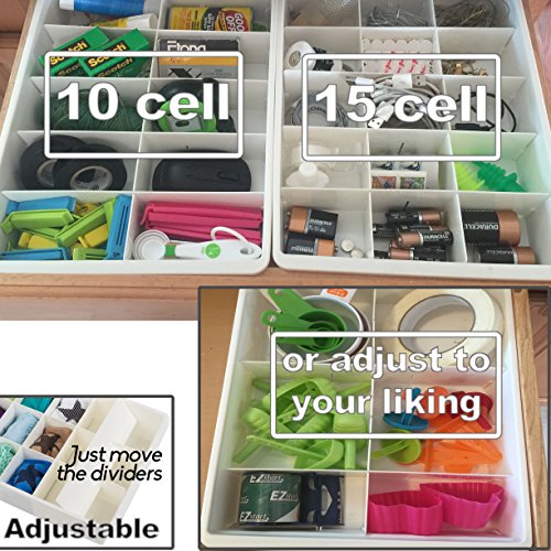 COMPLETELY ADJUSTABLE: Your set comes with 2 organizers with moveable dividers. Move lengthwise and crosswise to make the size of cells that work for you.