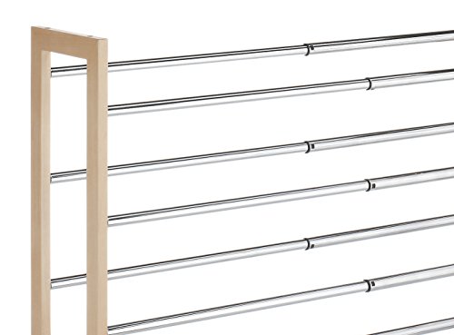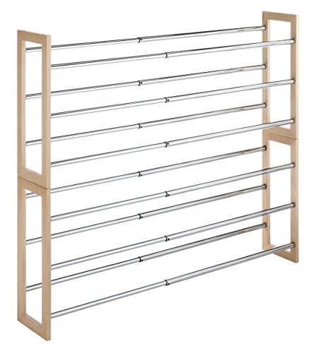 The best solution to keep your shoes and slippers organized is the Whitmor Wood and Chrome Shoe Rack. This shoe rack is designed to be expandable and stackable for additional shoe storage in your home, office, or dorm room. It can hold up to 18 pairs of shoes and can be expanded from 25 inches to 46 inches. The frame is made from wood while the support bars are made from chrome metal for a diversified look and durability. This has an easy no tool assembly and boasts a beautiful wood frame. Whitmor is a 4th generation family-owned and operated business. Since 1946, Whitmor has been dedicated to bringing organization home by creating products that simplify everyday life. Ensuring that those products are built with integrity, value, and innovation is our commitment to you. And our promise is that we will always be here for you should you ever need us as we stand behind our product 100%. Whitmor customer service is available in English and Spanish Monday through Friday from 8am - 4:30pm CST. Call us and we will gladly assist you in your language.Natural wood frame with 3 chromed metal expandable support bars holds up to 18 pairs of shoes